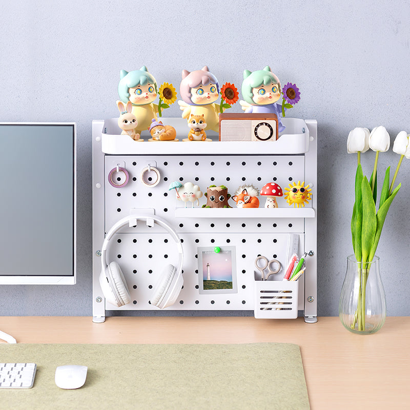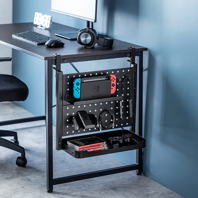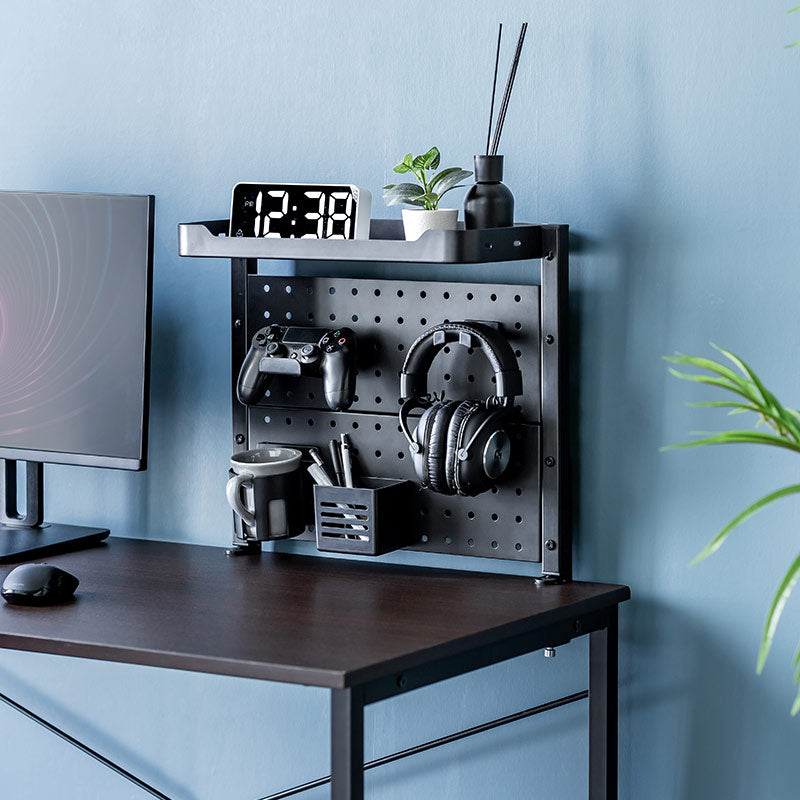- Clamp-on pegboard: Can be mounted above or below the desk.
